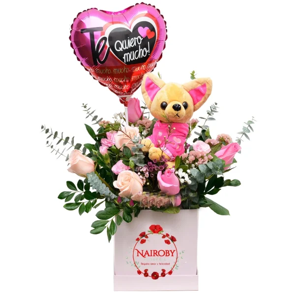 Box cuadrado con 6 hermosas rosas rosada y fucsias, claveles y follajes + peluche de chihuahua chico + globo mediano (según ocasión).